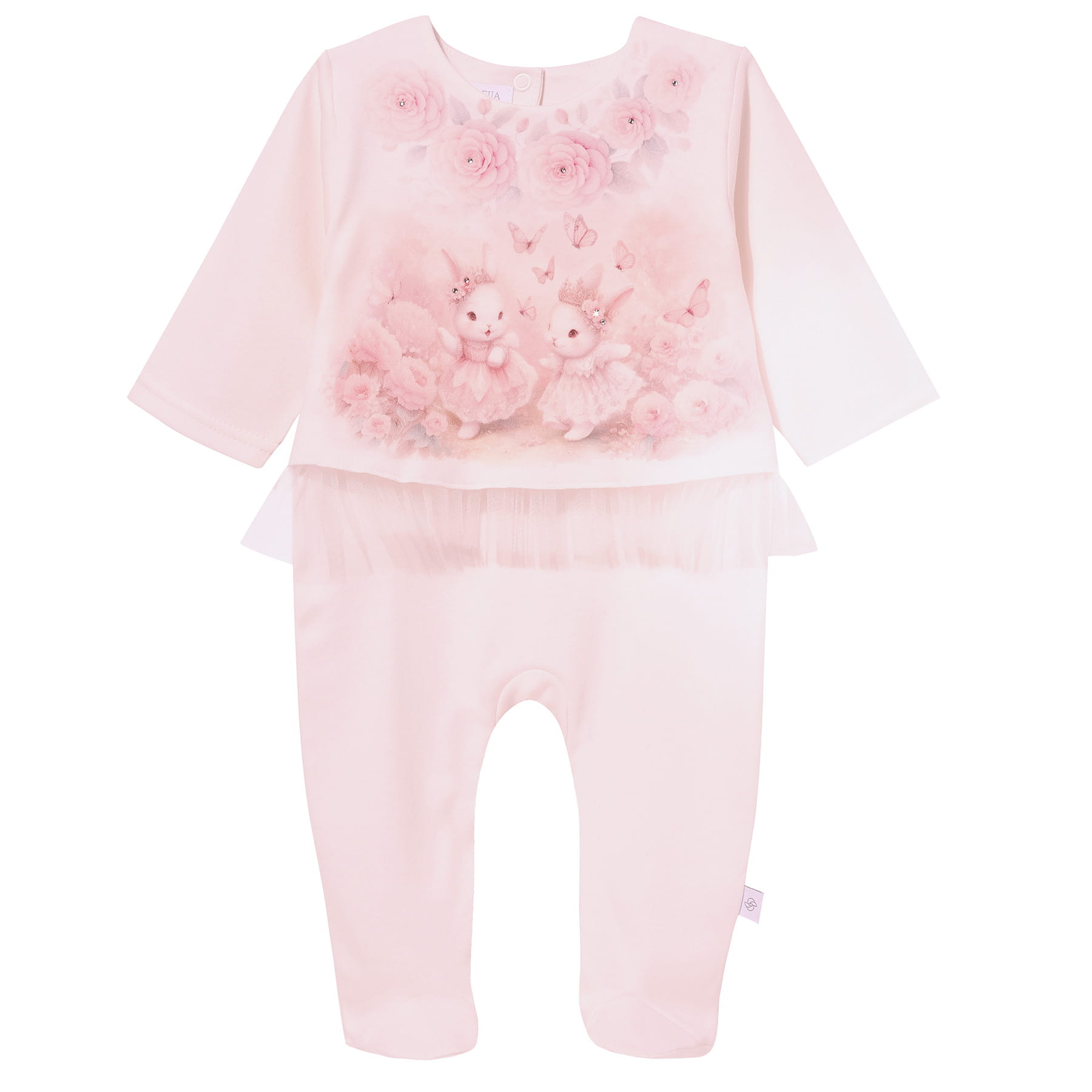 An adorable cotton babygrow decorated with a floral bunny print and a subtle tulle frill at the waist
