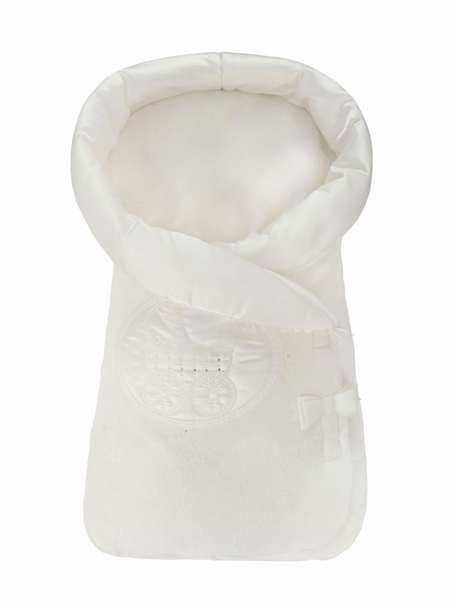 Ivory baby nest with baby stroller embroidery and small ribbons.