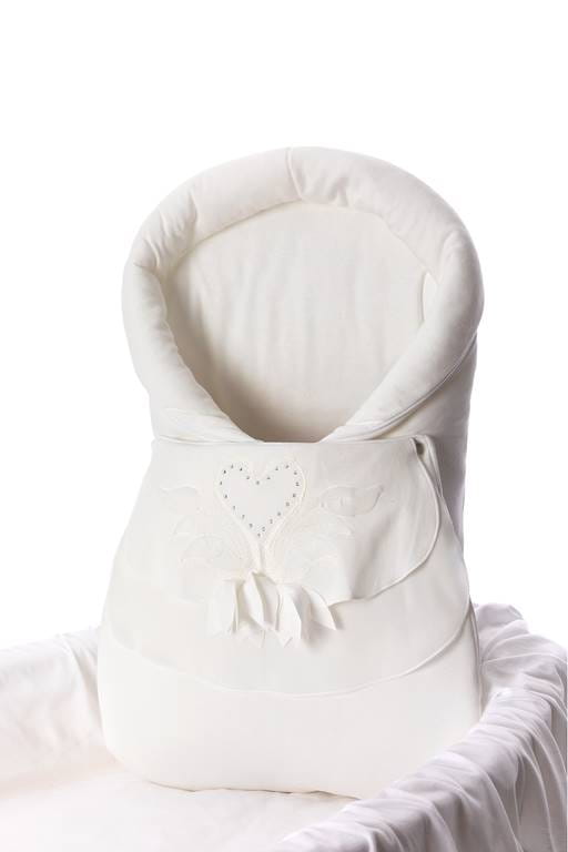 Ivory baby nest with swan emboridery decorated with feathers and jets.