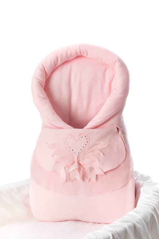 Pink baby nest with swan emboridery decorated with feathers and jets.