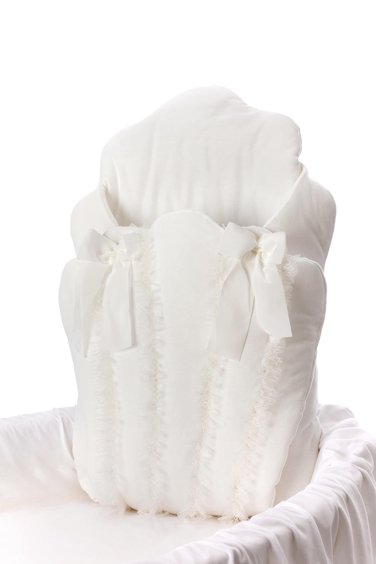 Ivory baby nest in shell shape with decorative ribbons.