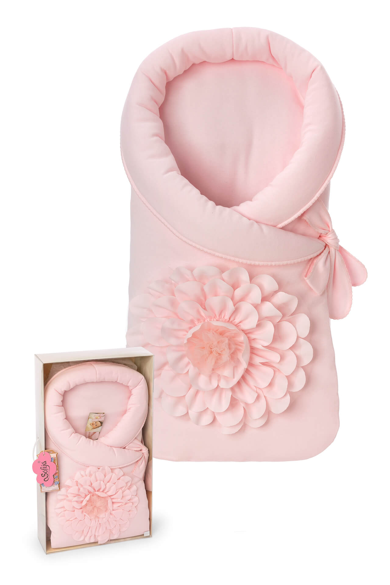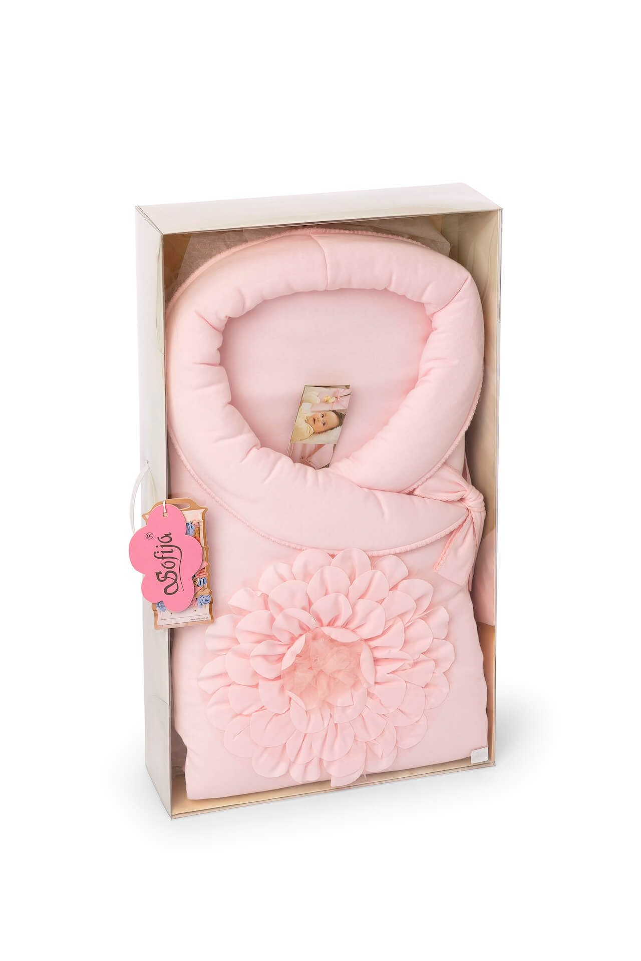 Pink baby nest with 3d flower and decorative ribbon at the front.