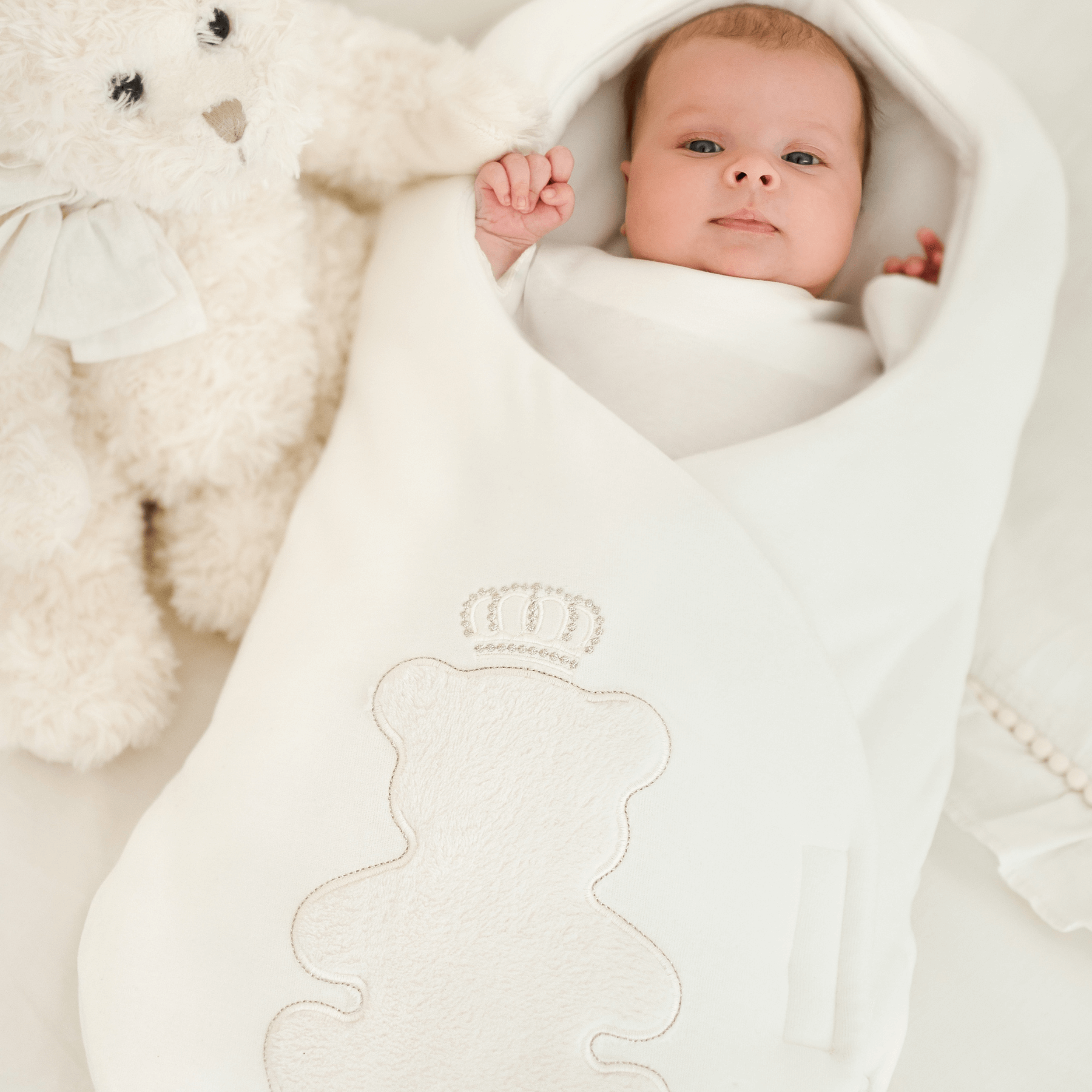 What makes this collection truly special is the beautiful embroidered appliqué of a teddy bear with a crown, crafted on plush fabric. The entire design is intricately embroidered with golden thread