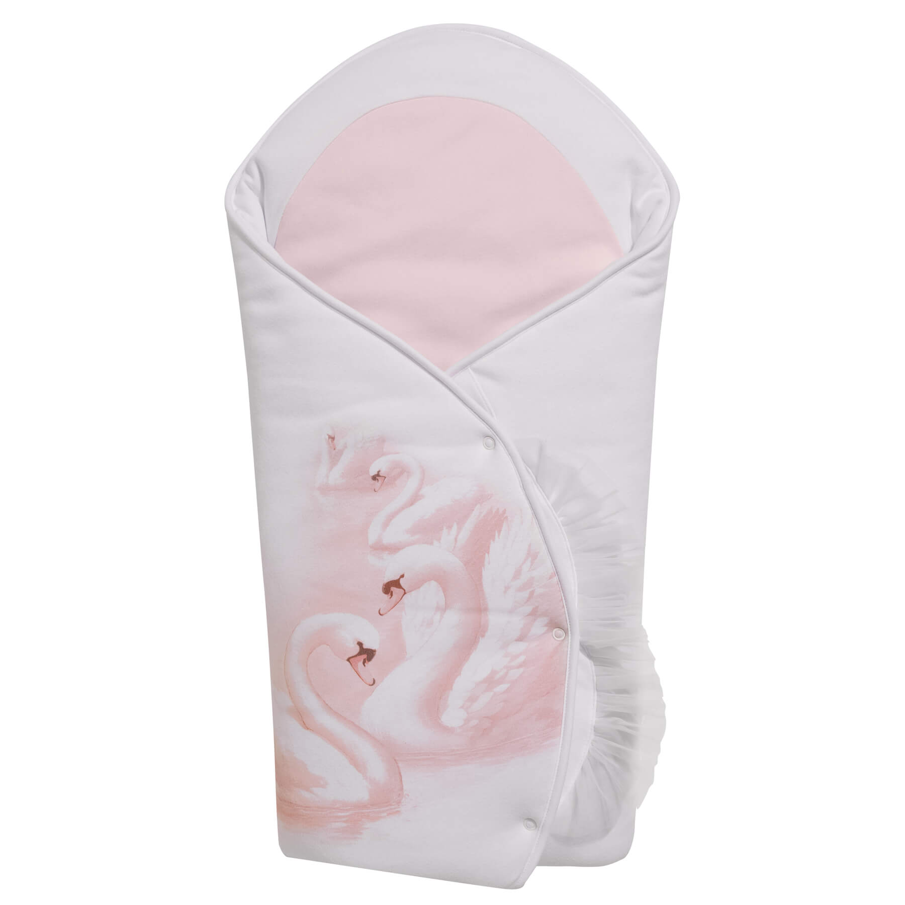 Elegant cotton baby nest with decorative details with swan motif and frill.