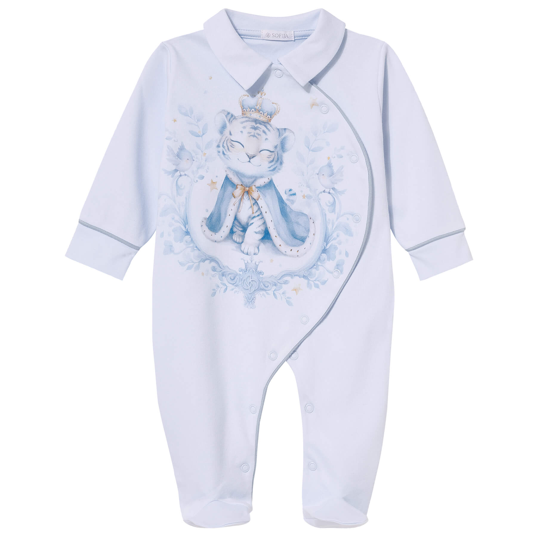 A stylish and comfortable baby boys’ babygrow made from the highest-quality materials, perfect for a newborn’s first months. The front-opening design with concealed poppers makes changing quick and easy, ensuring comfort for both baby and parents. A classic collar adds a touch of elegance, while the decorative tiger print on the front gives it an adorable character.