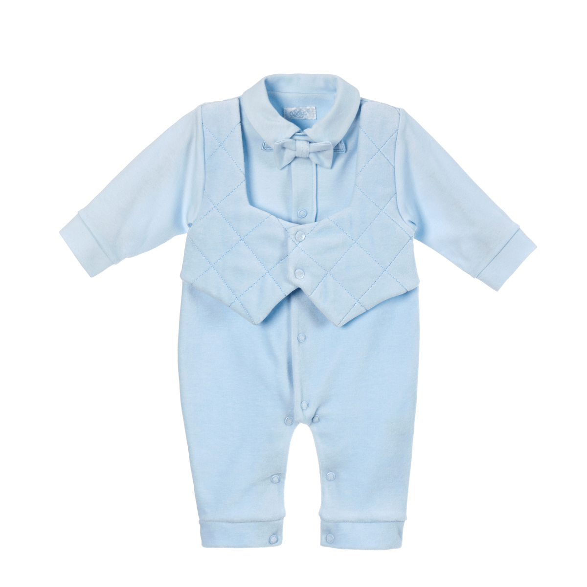 Elegant babygrow for a boy. Soft, warm and breathable cotton 100% Oeko-Tex certified. Babygrow with collar, bow tie and elegant vest. Perfect for special occasions.