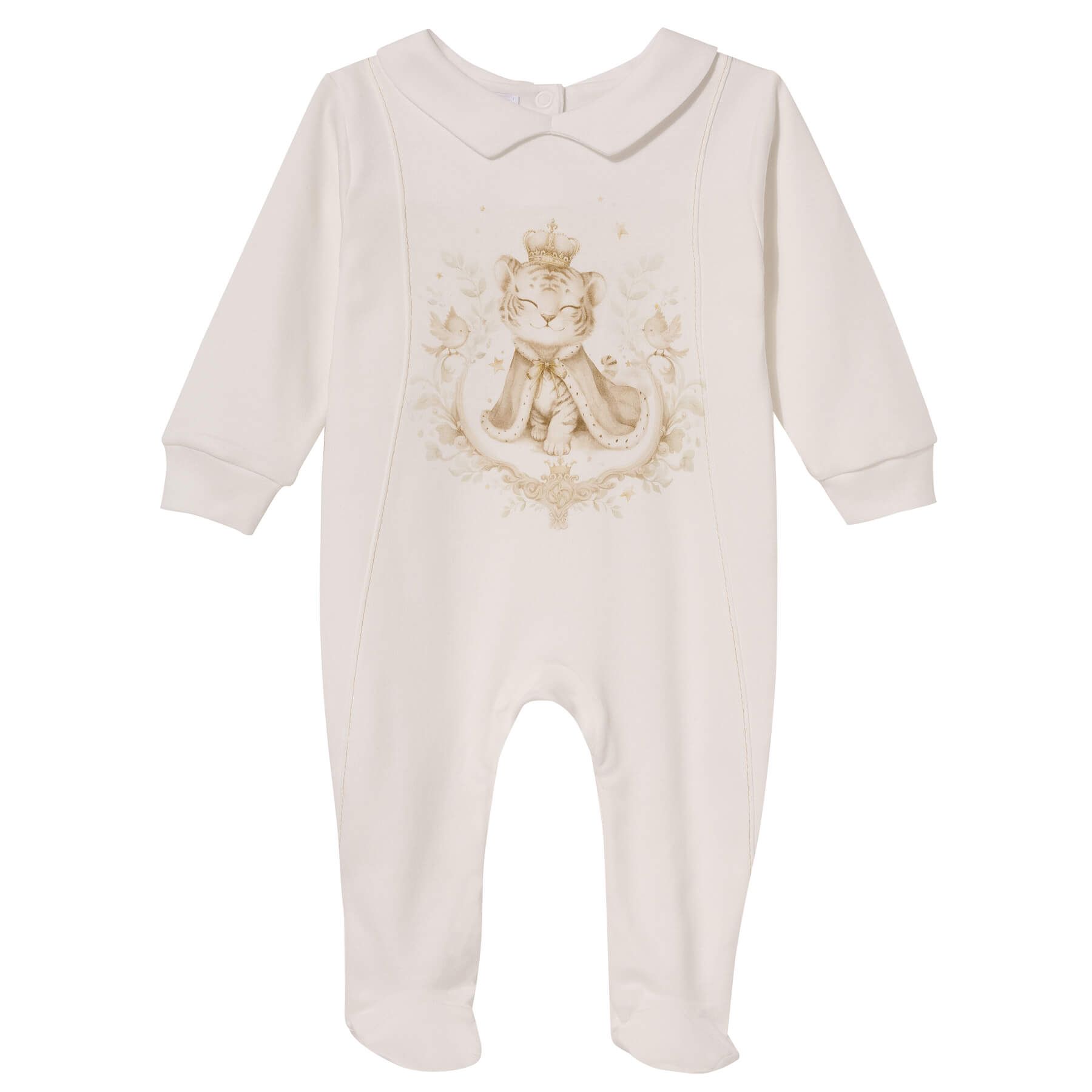 A stylish and comfortable baby boys’ babygrow made from the highest-quality materials, perfect for a newborn’s first months. The practical snap fastening between the legs makes diaper changes quick and easy, ensuring comfort for both baby and parents. A classic collar adds a touch of elegance, while the decorative tiger print on the front gives it an adorable character.