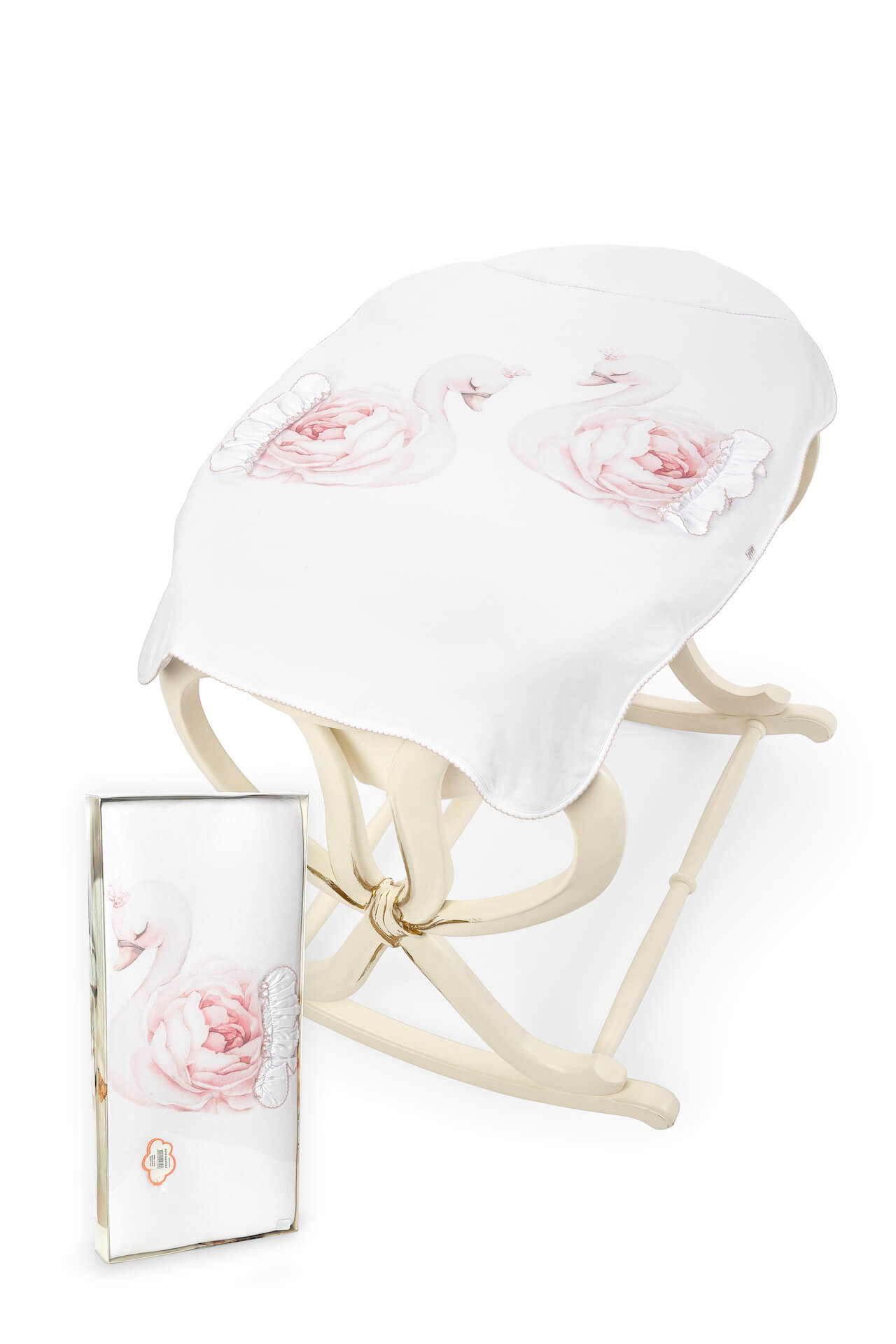 Luxurious baby girl blanket, ideal for a gift and as an essential part of the first baby layette. Made of 100% soft and delicate cotton and filled with anti-allergenic fibers, it will provide a comfortable environment for the baby on colder days.