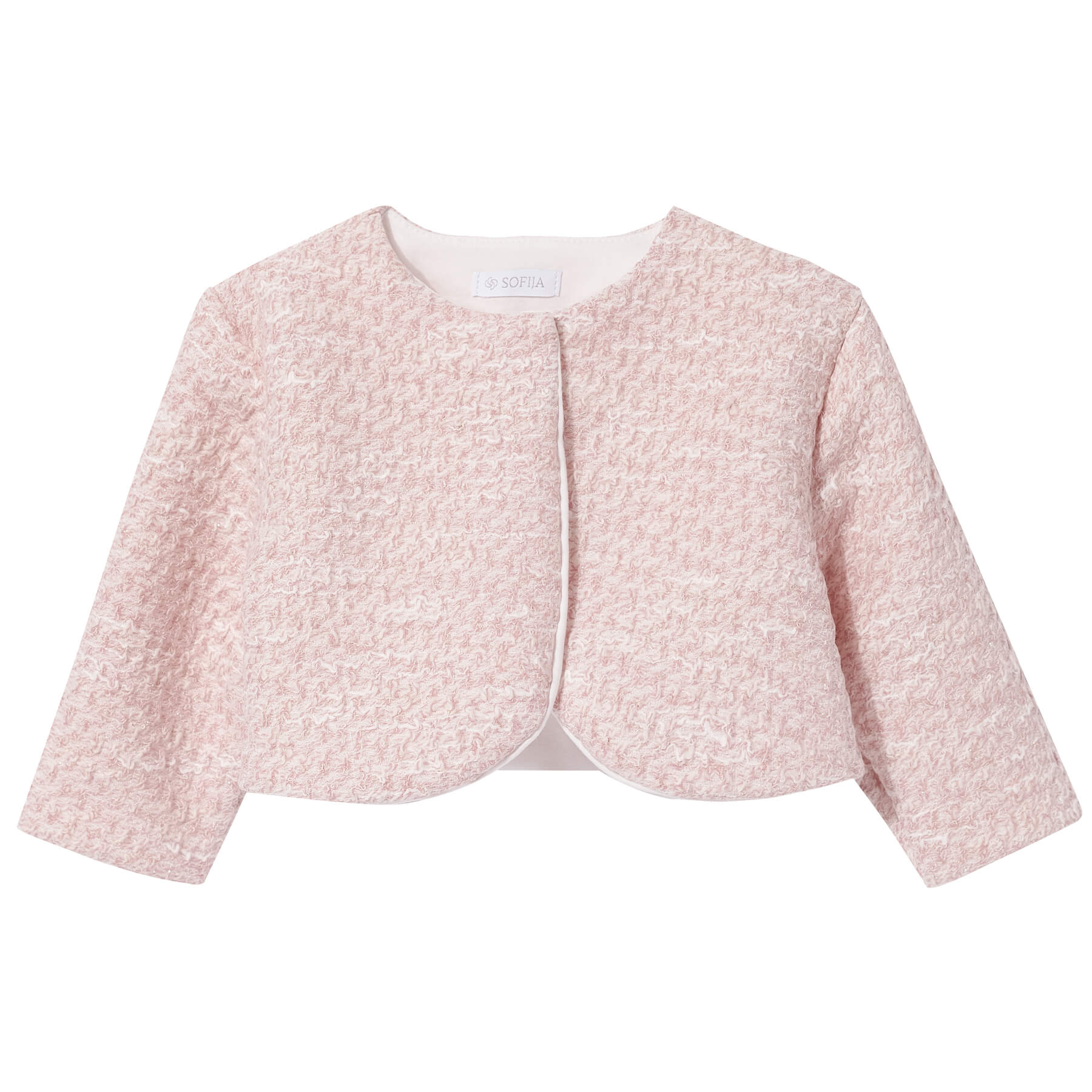 Short description: Lightweight tweed-effect bolero with a rounded neckline and soft cotton lining.