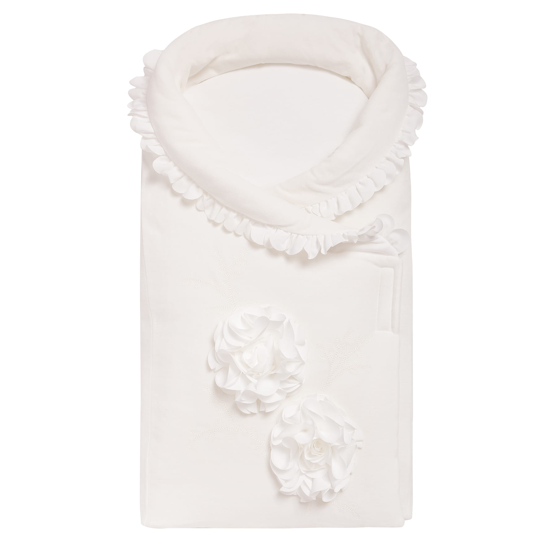 - Decorative dimensional flowers and frilly collar; branches embroidery