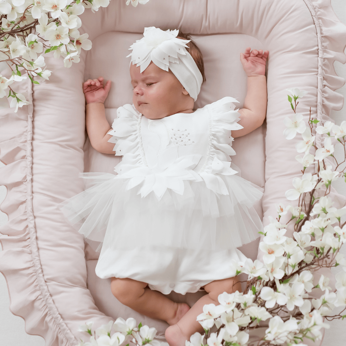 Sofija headbands are all handmade. Special cut and wide, non-compressing elastic band, trimmed with 100% soft cotton, makes the band non-slip and adapts to the baby's head. Covers the ears.