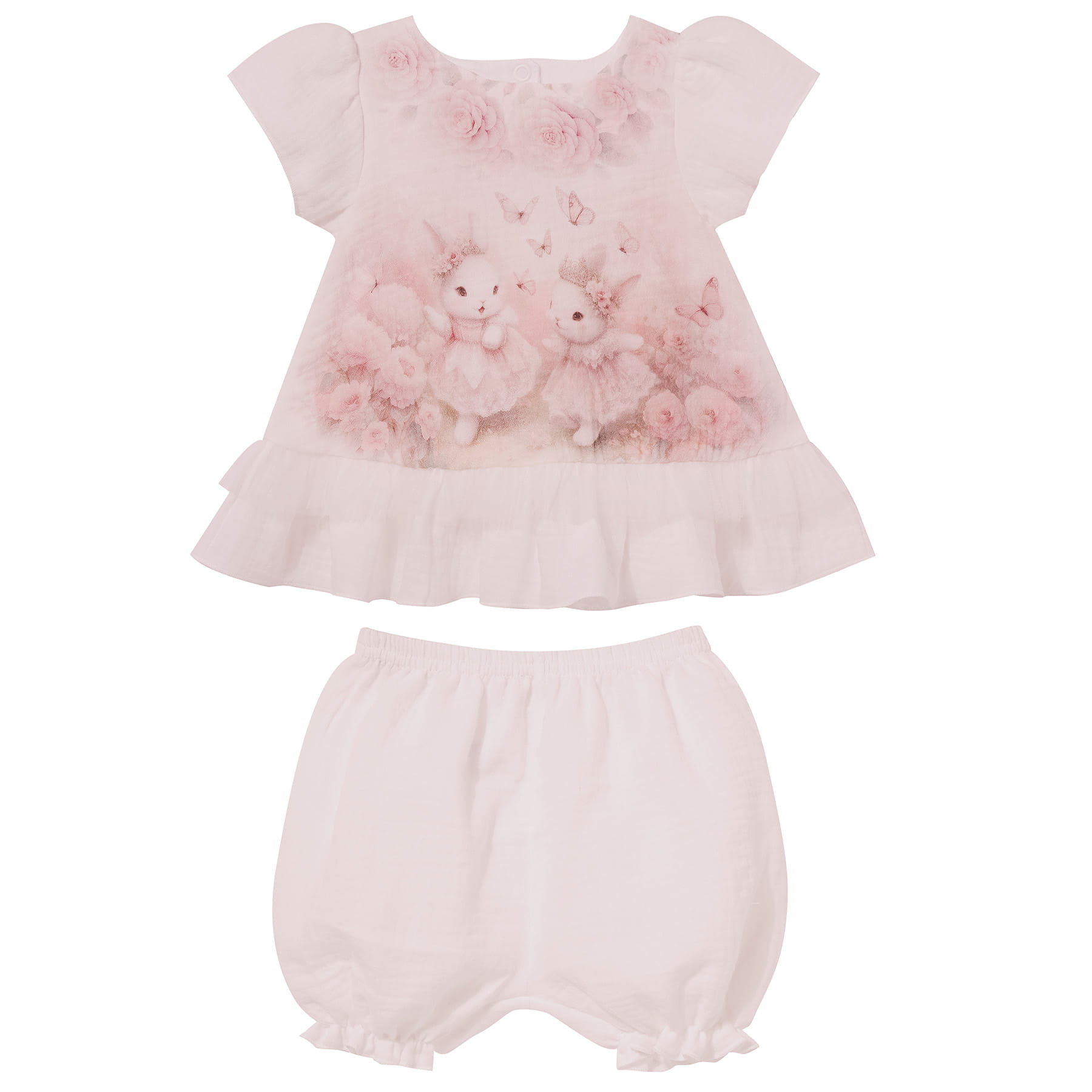 A delicate summer 2-piece set consisting of a printed frill blouse and matching bloomers