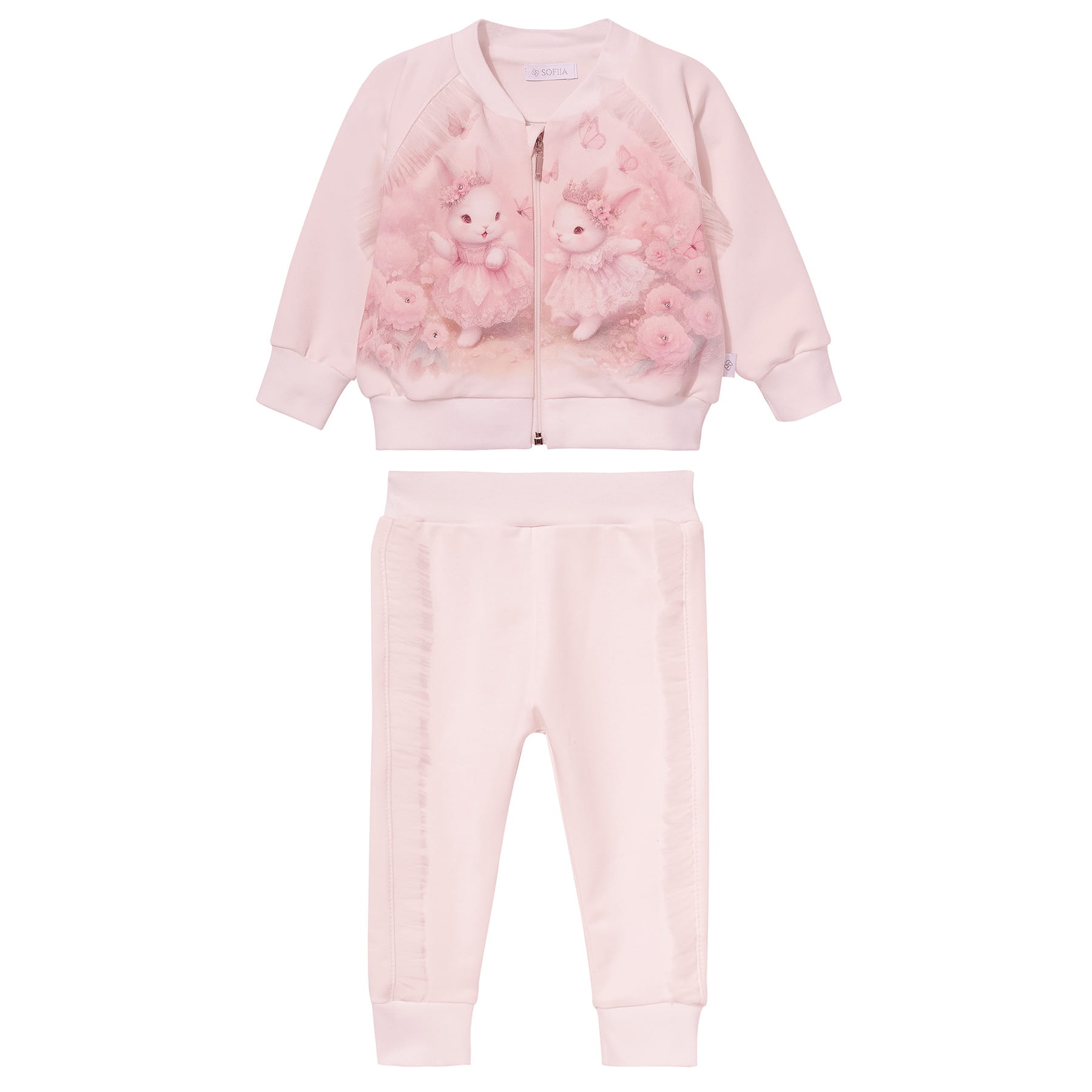 A cozy yet elegant outfit featuring a floral-print bomber-style sweatshirt and matching fitted pants with a tulle detail.