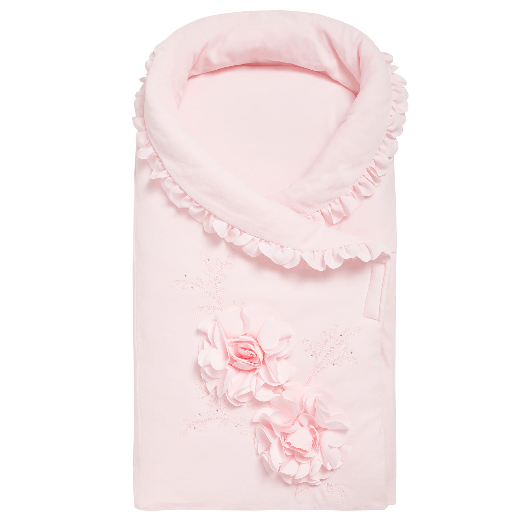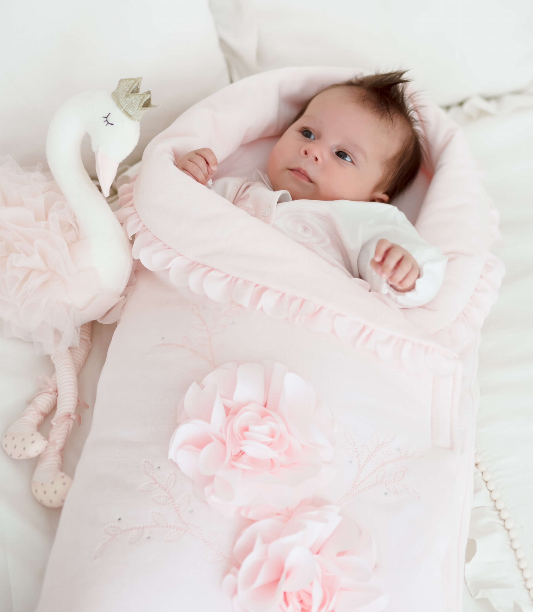 - Decorative dimensional flowers and frilly collar; branches embroidery