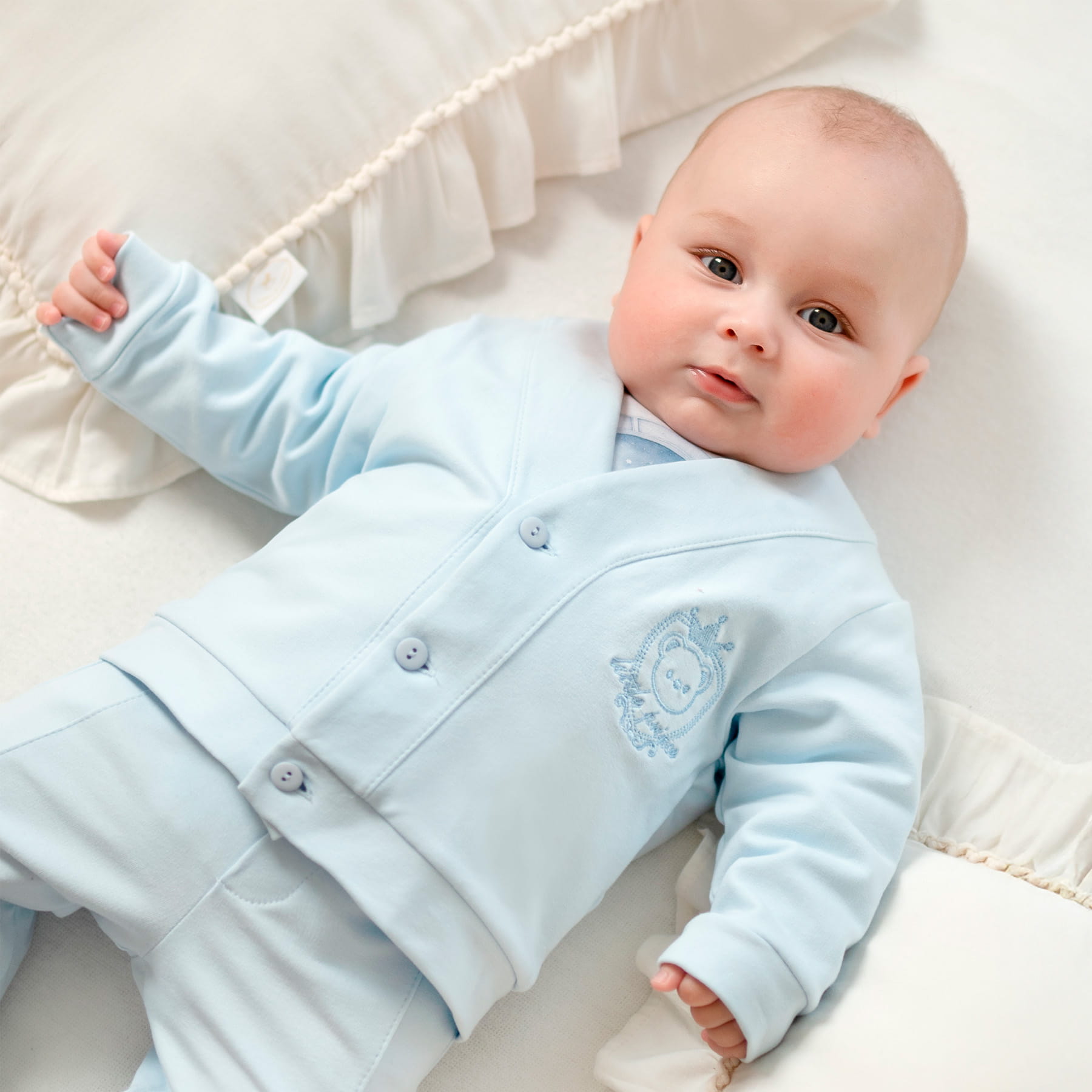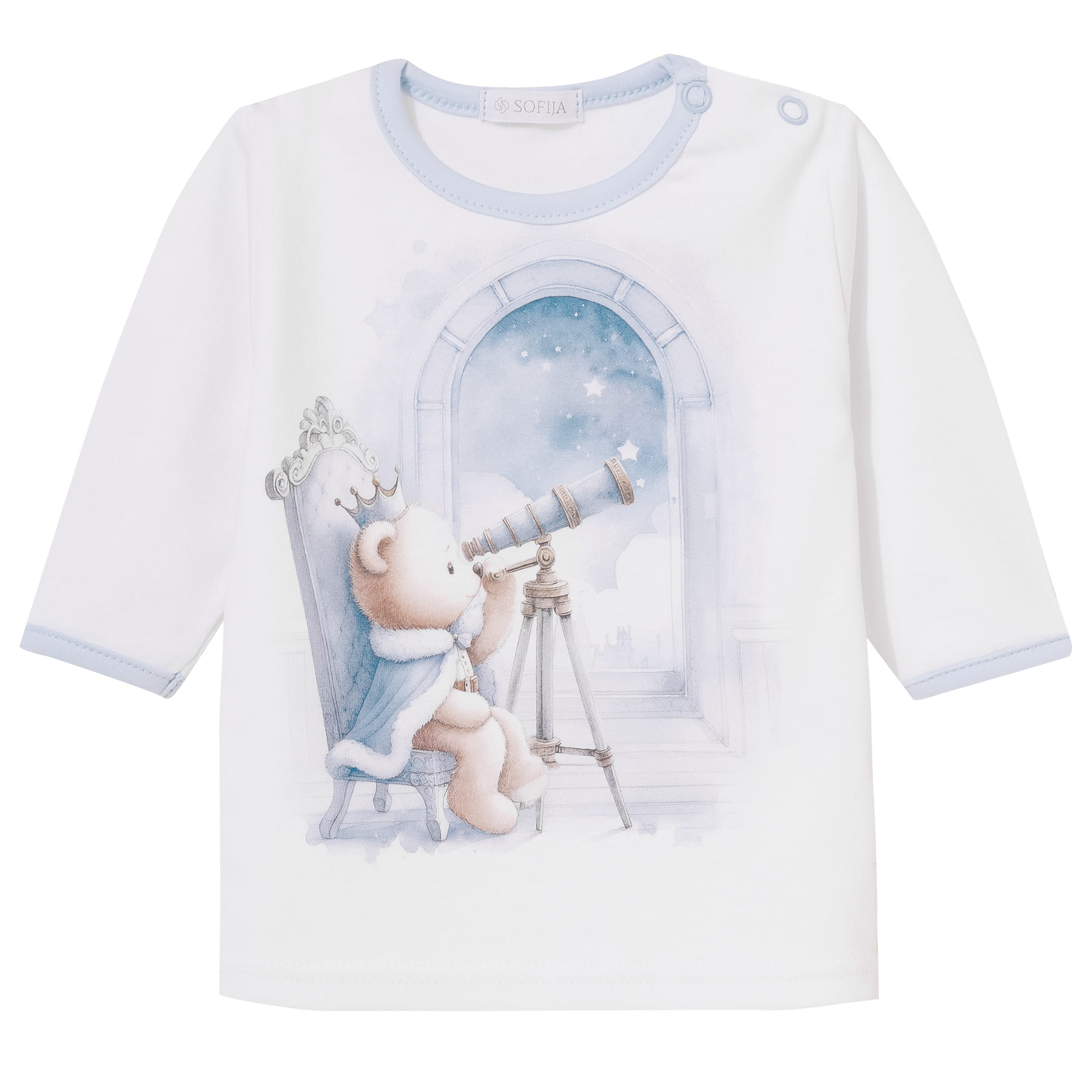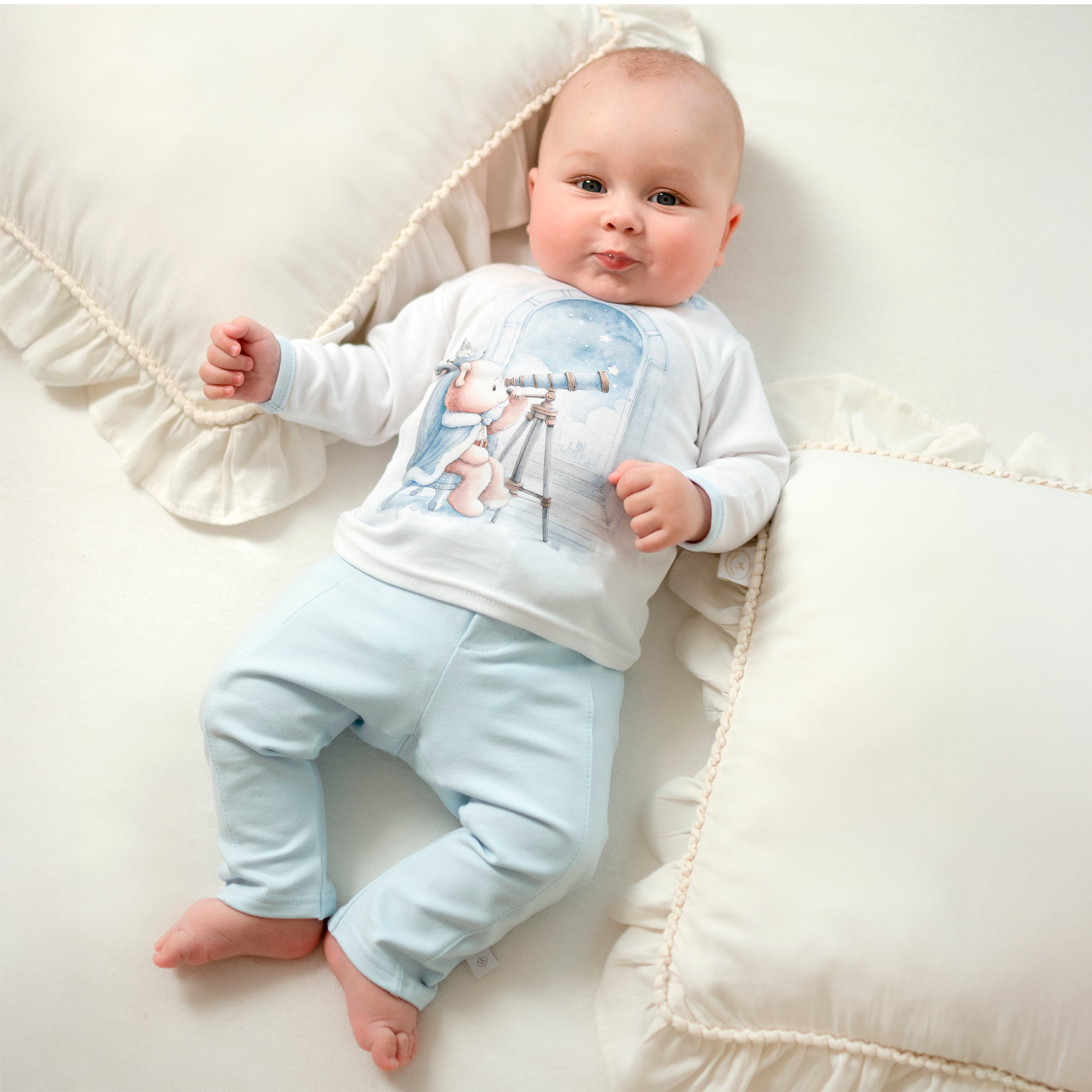 Inspired by a charming prince bear gazing at the stars, the collection evokes a sense of wonder and gentle sophistication. Soft shades of pastel blue and white enhance its timeless appeal, while refined embroidery and thoughtful detailing reflect true European craftsmanship.