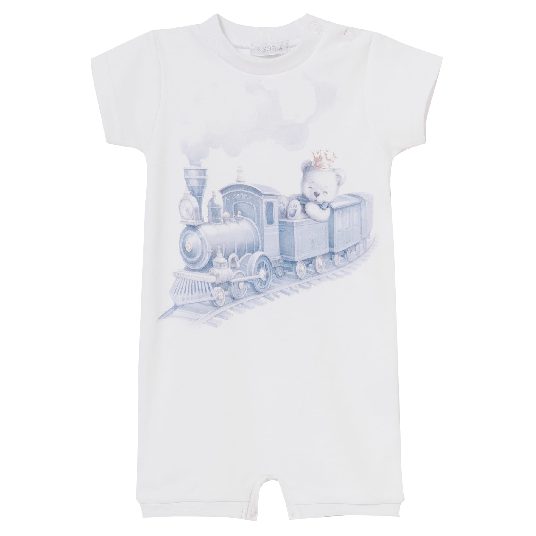 - Details: train print with a teddy bear wearing a crown, snap buttons on the shoulder