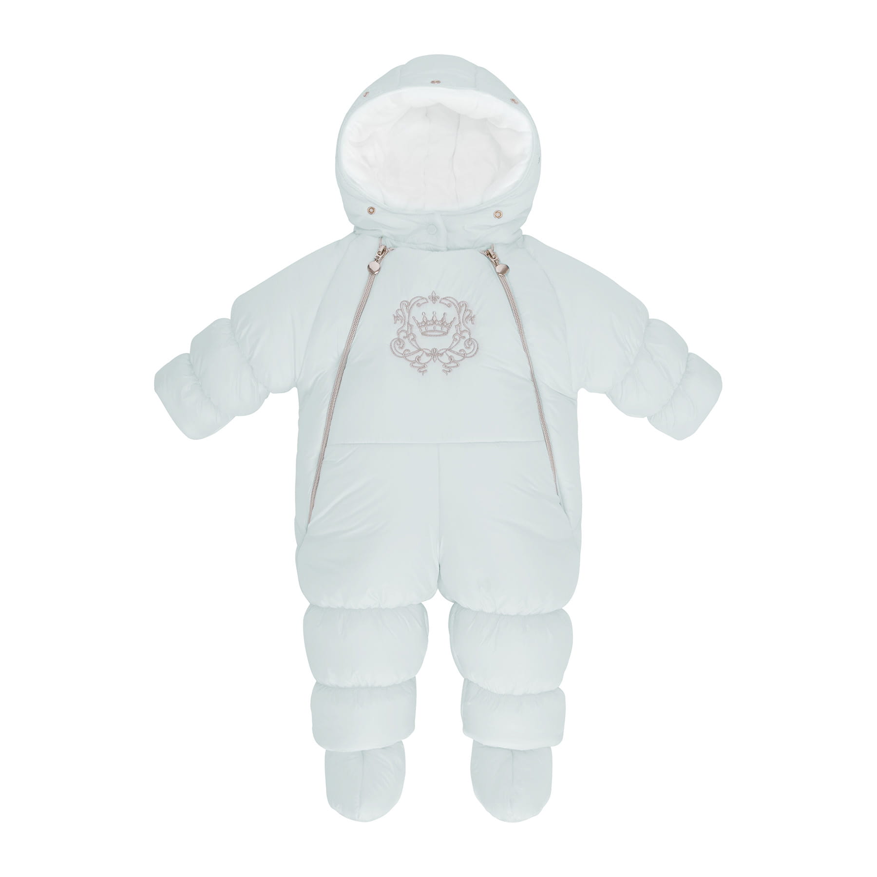 Shiny blue puffer snowsuit for baby boys and baby girls. Made from Italian silky smooth nylon. Lining made of soft and delicate 100% cotton cotton jersey and padded with antiallergic fibers, which provides excellent protection from extreme temperatures.