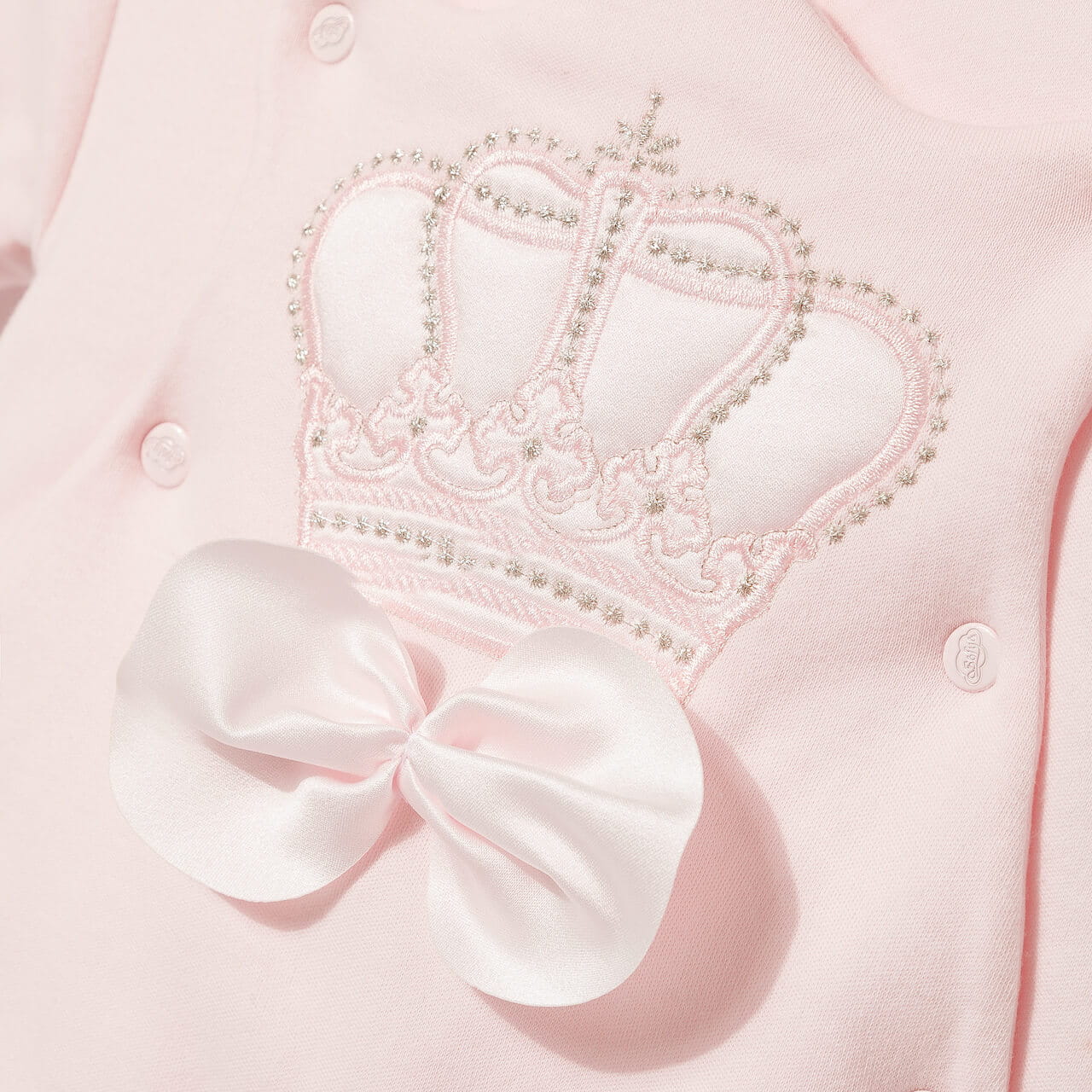 Ozdobiony pięknym haftem korony oraz satynową kokardą.