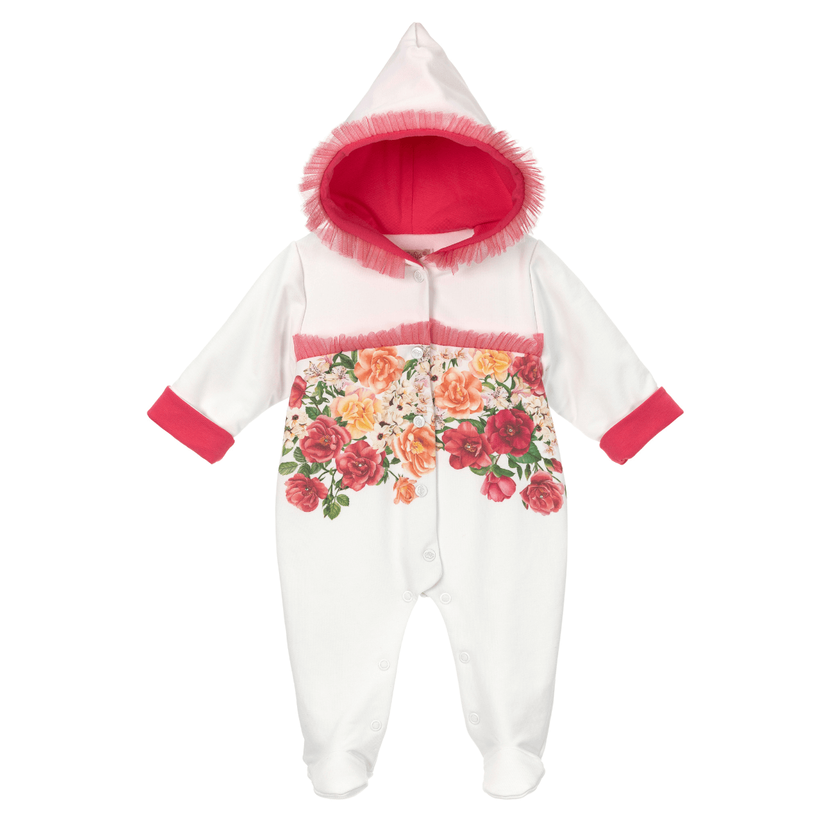 Pajac rozpinany z kapturem biało-malinowy MIRELLA