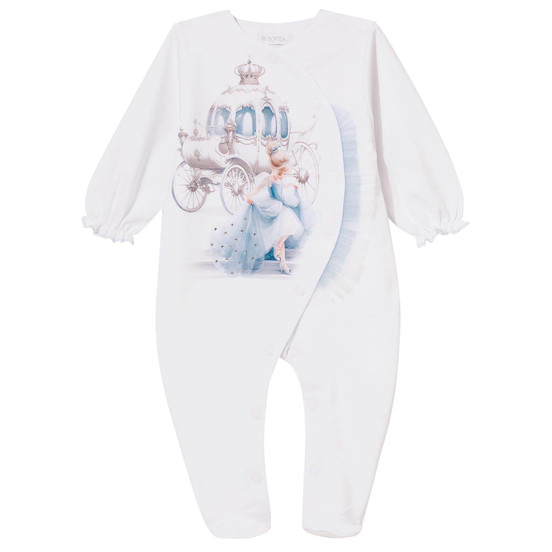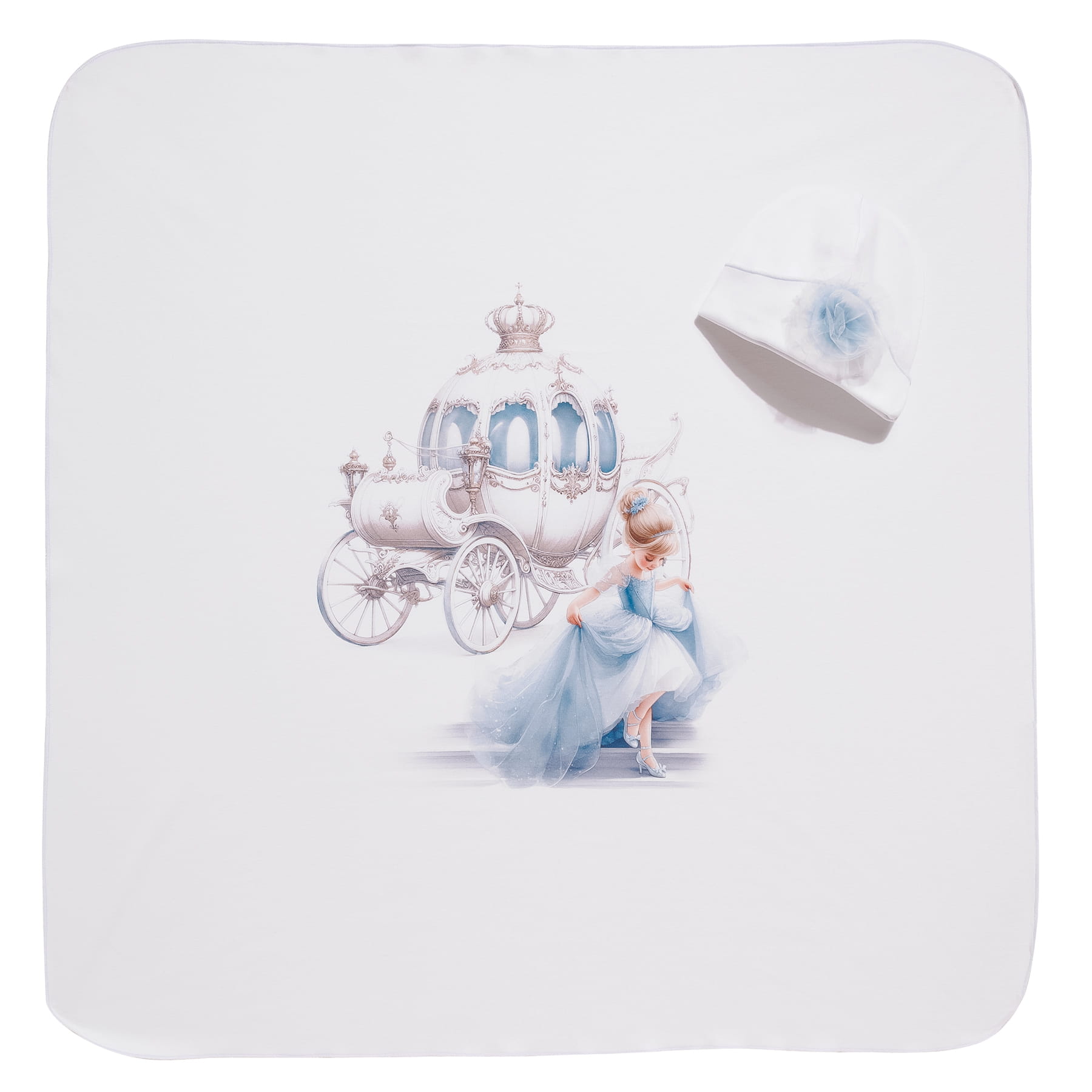 Uroczy zestaw dla noworodka inspirowany światem księżniczek, w którego skład wchodzą miękki pajac, dopasowana czapeczka oraz ozdobny kocyk — wszystkie elementy zdobione magicznym motywem karety i kwiatowych detali.